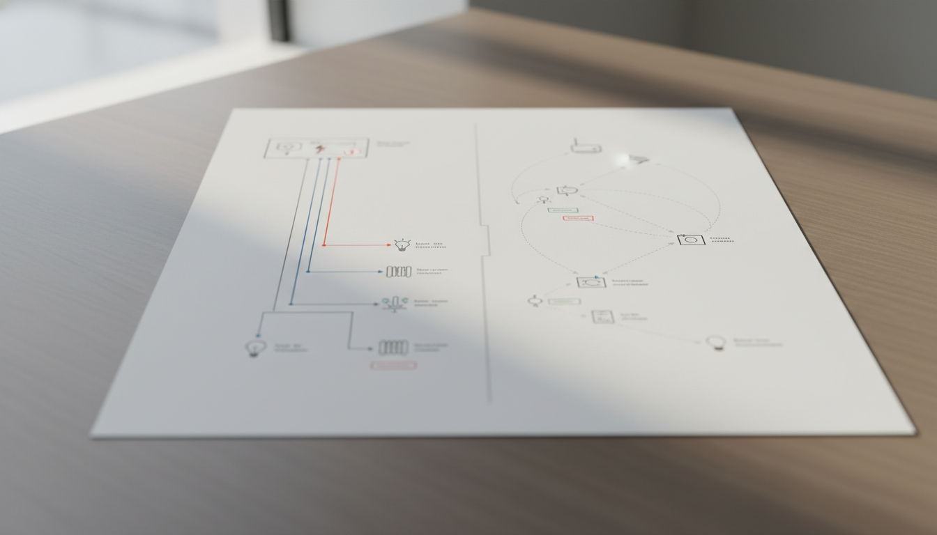 В этот момент легко пойти по пути «куплю пару Wi‑Fi‑лампочек и колонку — посмотрим, что получится». На старте это выглядит разумно, но через пару лет такой подход часто превращается в перегруженный Wi‑Fi, десяток разных приложений и ощущение, что система живёт своей жизнью. Поэтому выбор архитектуры — умный дом проводной или беспроводной — лучше сделать до того, как вы утвердите схему электрики и потолков.
